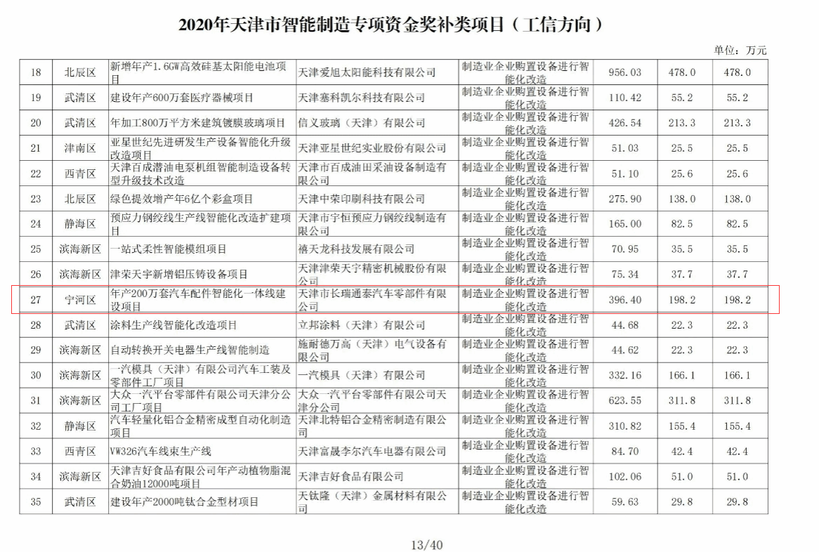 本项目以天津市长瑞通泰汽车零部件有限公司建设年产汽车配件智能化一体线为目标,总投资12000万元,已完成投资8000万元,总占地3000平方米,建设汽车配件的智能焊接生产线、智能清洗线、智能喷涂及电泳生产线,并购置相关模具及相应辅助设施,形成年产200万套汽车配件的的生产规模。目前公司主要为一汽大众天津工厂、海斯坦普(奔驰)项目配套。